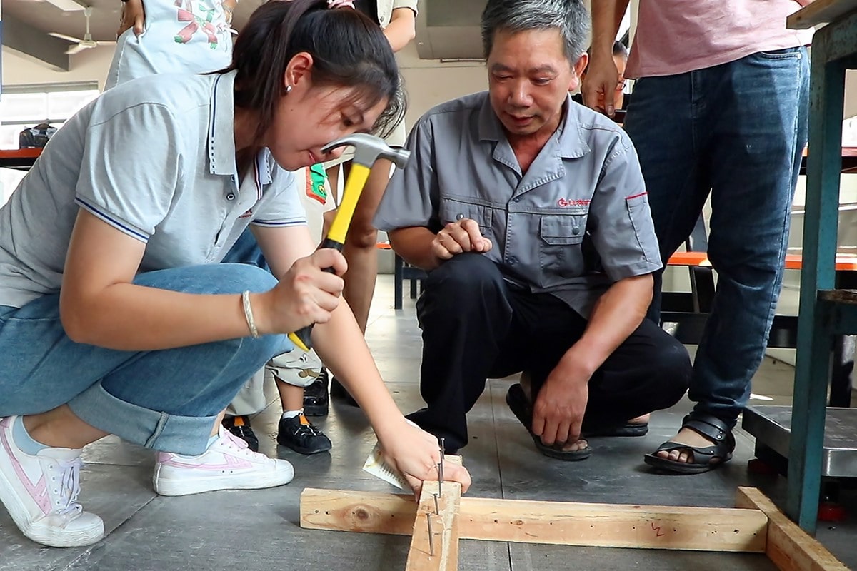 敲釘子活動則是對參與者動手能力的一次考驗。員工們需要在規定次數內將釘子完全敲入木板,成功者可獲得兩枚印章。雖然看似簡單,但實際操作中需要相當的技巧與專注力,不少經驗豐富的一線男員工紛紛失手,不是敲空,就是打歪。相反女員工收獲滿滿,一錘入木三分,兩錘手到擒來。