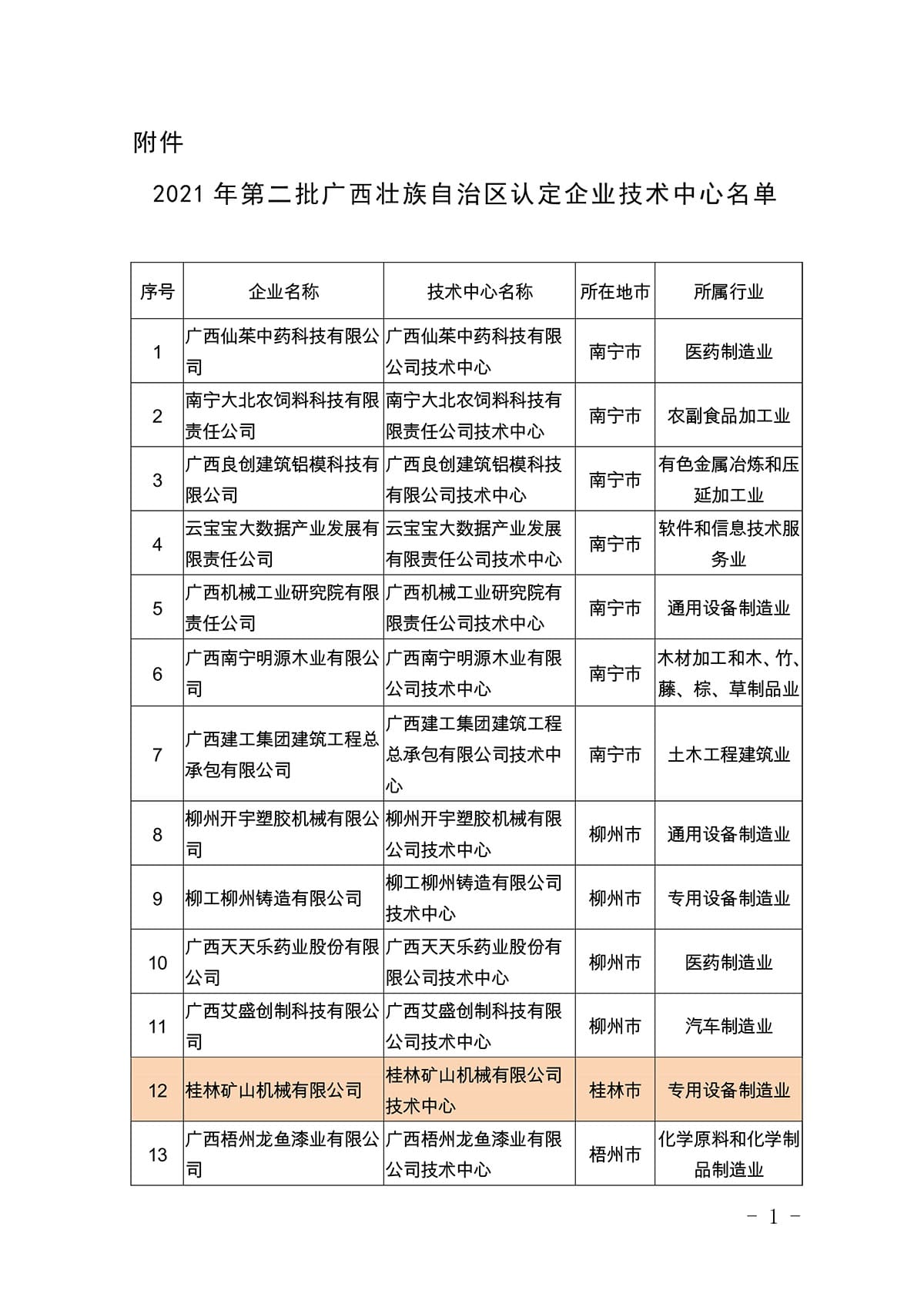 10月29日,自治區工業和信息化廳等6部門關于公布2021年第二批廣西壯族自治區新認定企業技術中心名單的通知(桂工信園區〔2021〕347號),桂林礦山機械有限公司榮列其中,被認定為自治區企業技術中心。這標志著桂林礦機在科技創新能力,新產品研發等方面較大的優勢,同時體現了公司注重科技投入和技術創新方面的卓越成就。